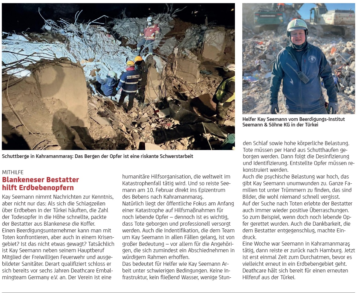 Wo einst Häuser standen, klaffen heute graue Löcher. Ganze Häuserzeilen sind verschwunden. Das Erdbeben, das am Montag, 6. Februar, die Türkei und Syrien erschütterte, war mit einer Stärke von 7,8 Magnitude eines der stärksten Beben in der Grenzregion seit fast 1000 Jahren. Tausende Menschen sind gestorben, ebenso viele wurden verletzt. Lebensretter aus aller Welt waren vor Ort, um Menschen aus den Trümmern zu bergen. Mit dabei war seit dem 10. Februar auch Kay Seemann vom Beerdigungsinstitut „Seemann & Söhne“ im Rahmen eines Einsatzes des DeathCare-Teams. Die Arbeit des ehrenamtlichen Vereins wurde der Türkei offiziell über das Kanzleramt angeboten.
