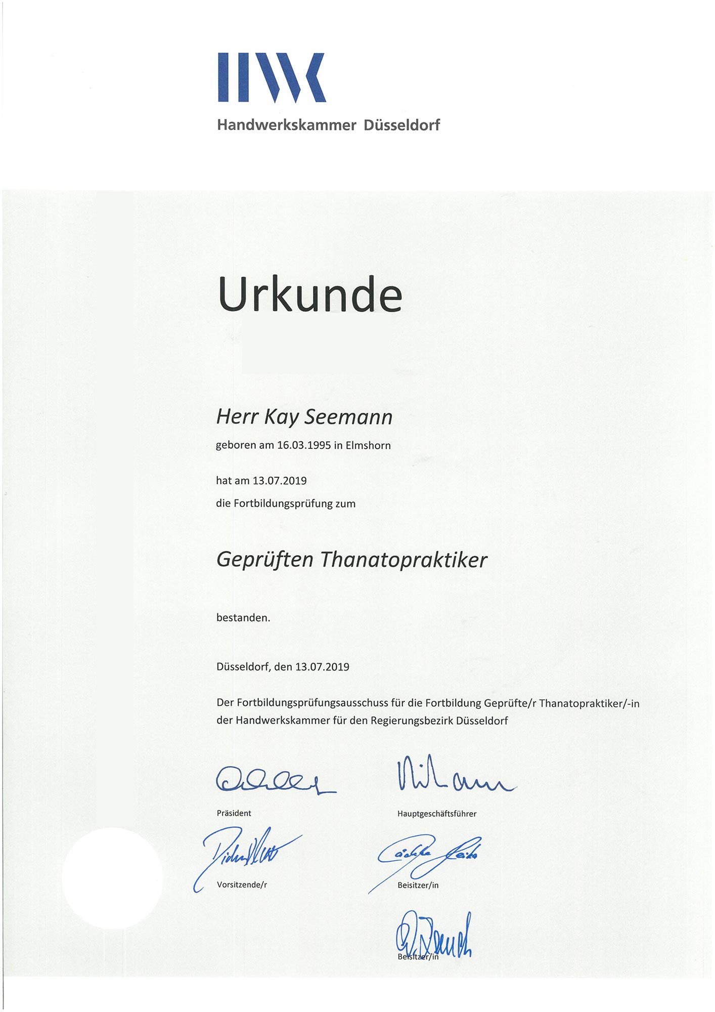 Das Ziel ist nicht, wie man es oft aus dem Fernsehen kennt, den Verstorbenen äußerlich fast besser erscheinen zu lassen als zu Lebzeiten, sondern einen pietätvollen Abschied möglich zu machen. Schließlich ist das Ziel eines jeden Angehörigen, durch eine Abschiednahme am offenen Sarg, die Erinnerung an den Verstorbenen zu bereichern. Unser geprüfter Thanatopraktiker Kay Seemann steht Ihnen für alle Fragen zu diesem Thema zur Verfügung.